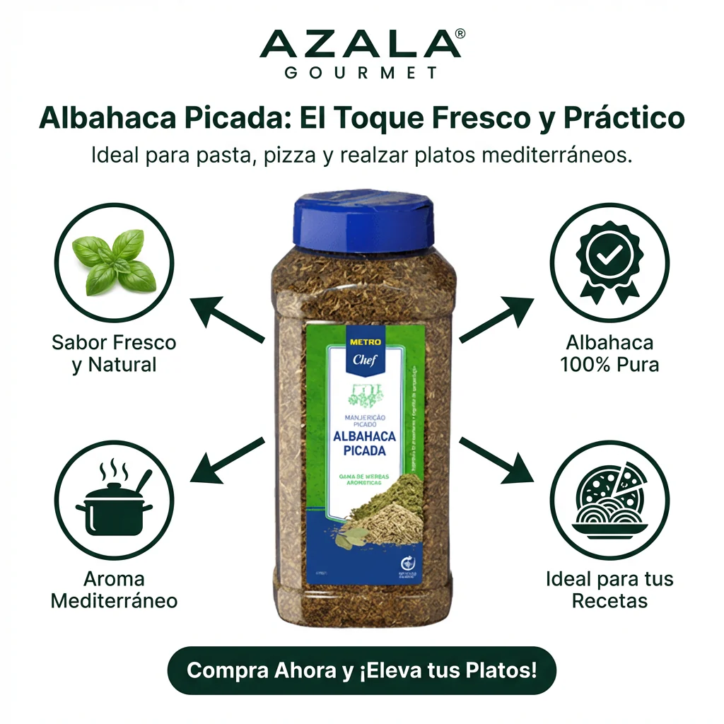 No pierdas la oportunidad de mejorar tus recetas con la albahaca picada Metro Chef, disponible ahora en Azala Gourmet. ¡Lleva la frescura de la albahaca directamente a tu cocina con un solo clic!