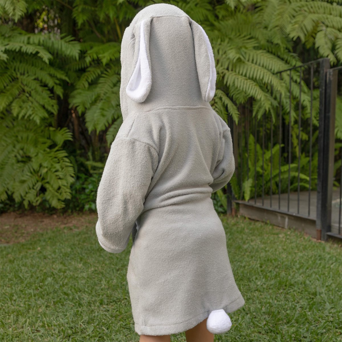 Ir la playa, alberca o tomar una ducha será más divertido ya que tu bebé se podrá secar con su animal favorito, con nuestro diseño de bata de baño para bebé Babuu Baby, hecha de toalla 100% algodón, con divertido diseño de conejo gris con orejas y ojos juguetones. La capucha protege los oídos del bebé o niño del aire, al sacarlos del agua.