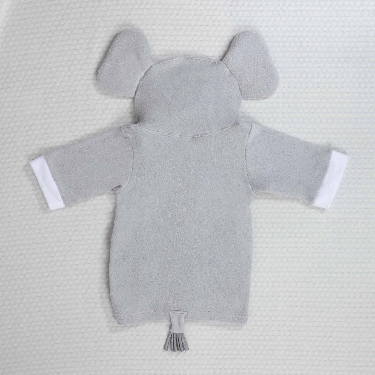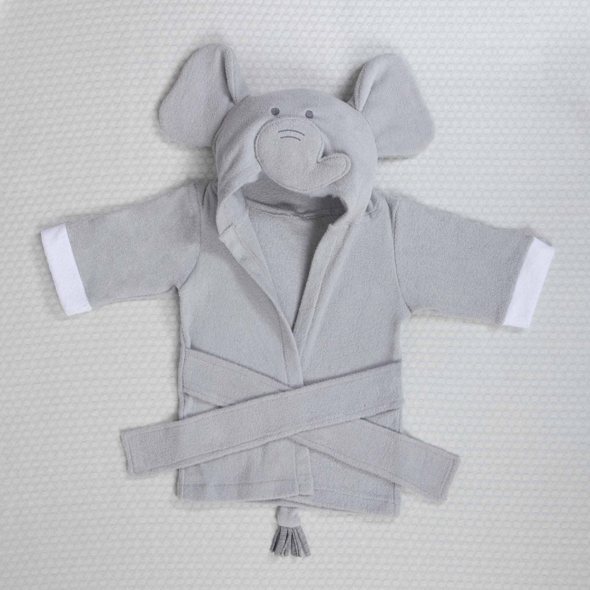 Mantén calientito a tu bebé después de salir de la ducha, alberca o playa con nuestro diseño de bata de baño para bebé Babuu Baby, hecha de toalla 100% algodón, con divertido diseño de Elefante gris con divertidas orejas y trompa tridimensional con cola de cordones gris. La capucha protege los oídos del bebé o niño del aire, al sacarlos del agua.