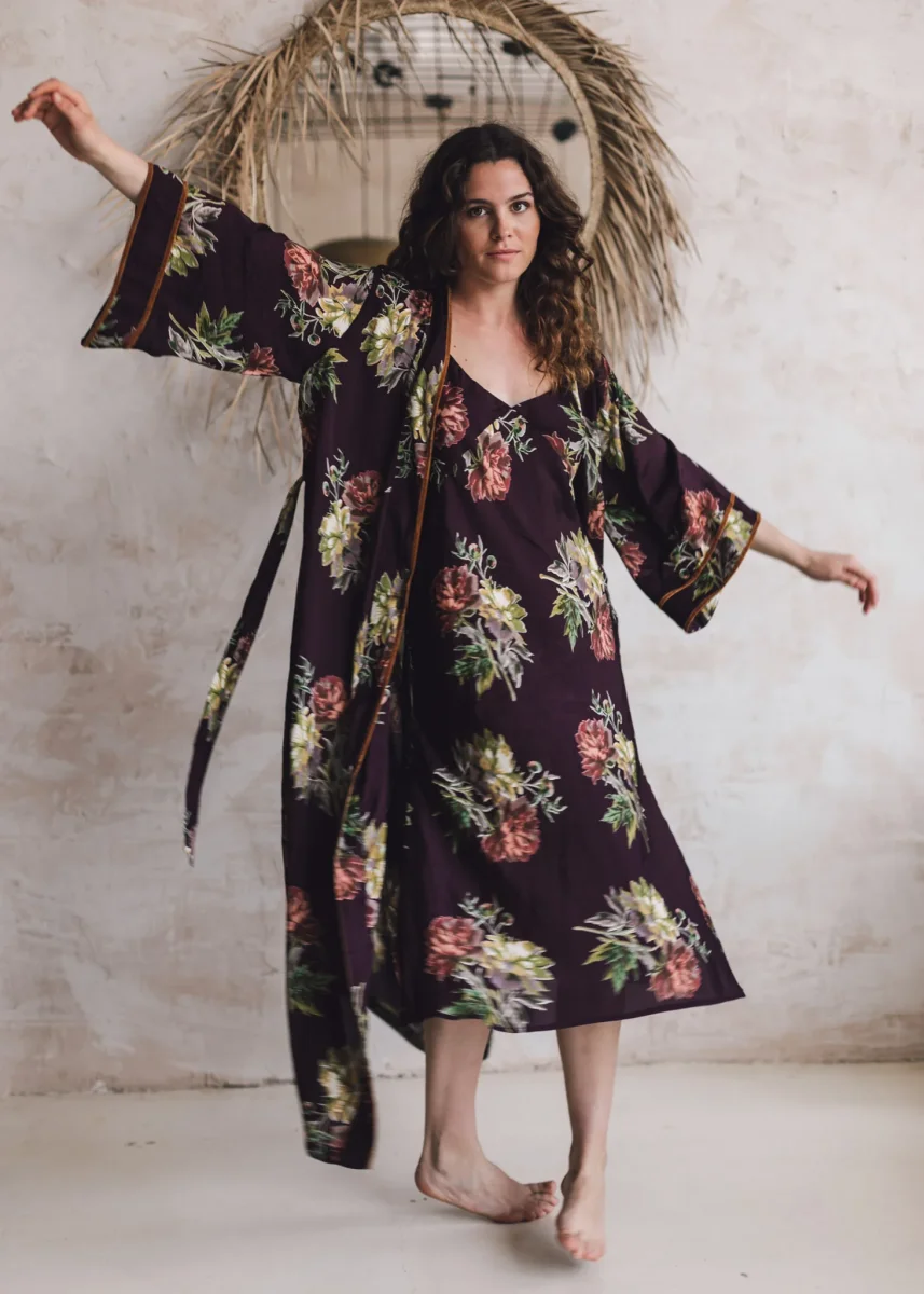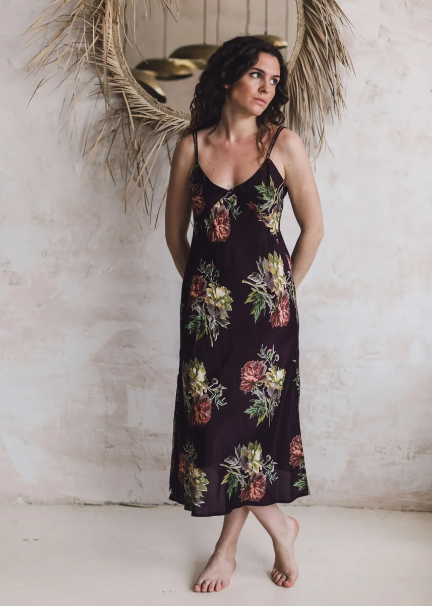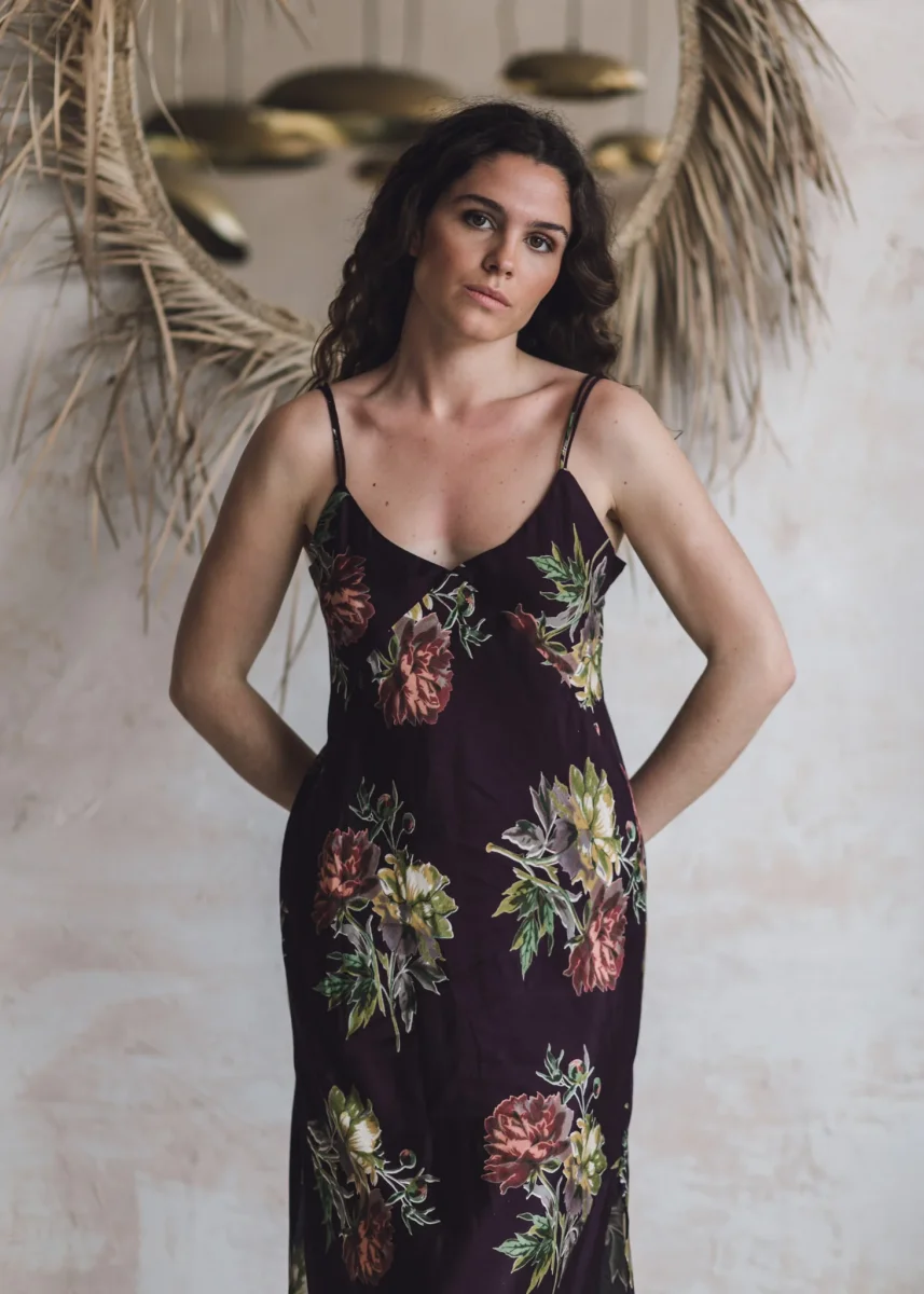 Camisón de tirantes y escote en pico, en color berenjena con flores estampadas en tonos rojos y verdes.