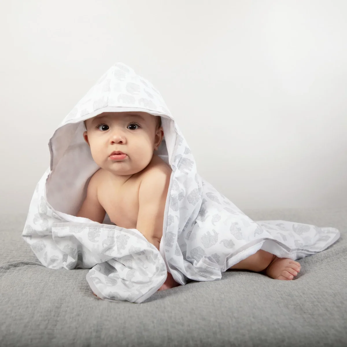 Nuestra capita Babuu Baby mantendrá a tu bebé calientito y seco, gracias a su doble capa, en el interior toalla suave blanca 100% algodón y exterior de tela impresa 100% algodón, cuidando la piel de tu bebé. Tiene divertido diseño de elefantes en tonos de gris y tiene un gorro amplio para proteger la cabeza de tu bebé de los cambios de temperatura.