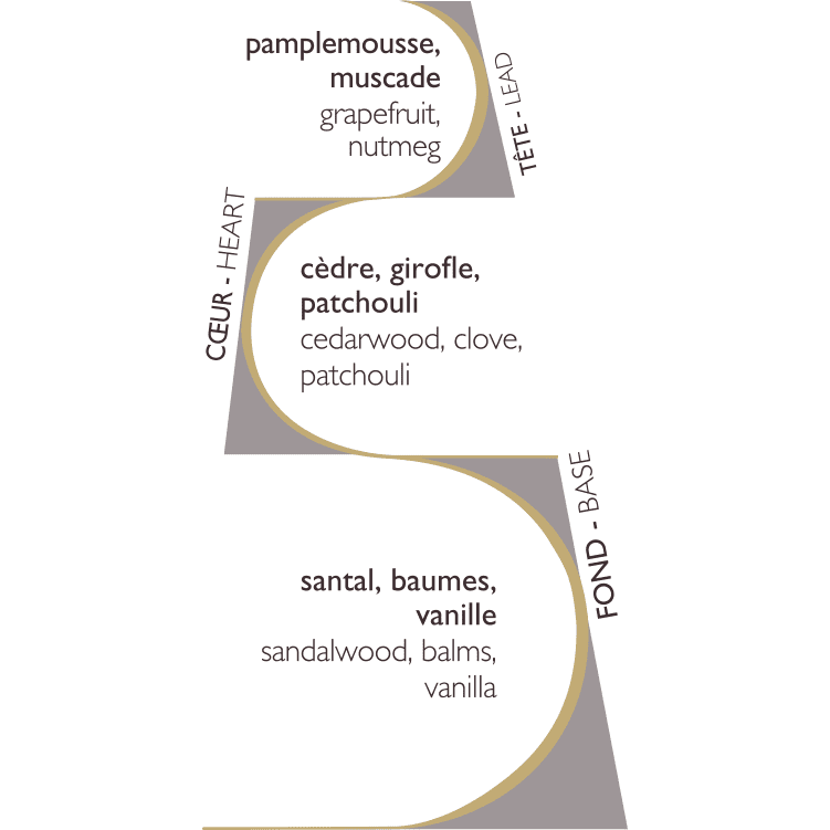- Notas de salida: Cedro, Pomelo y Nuez Moscada.