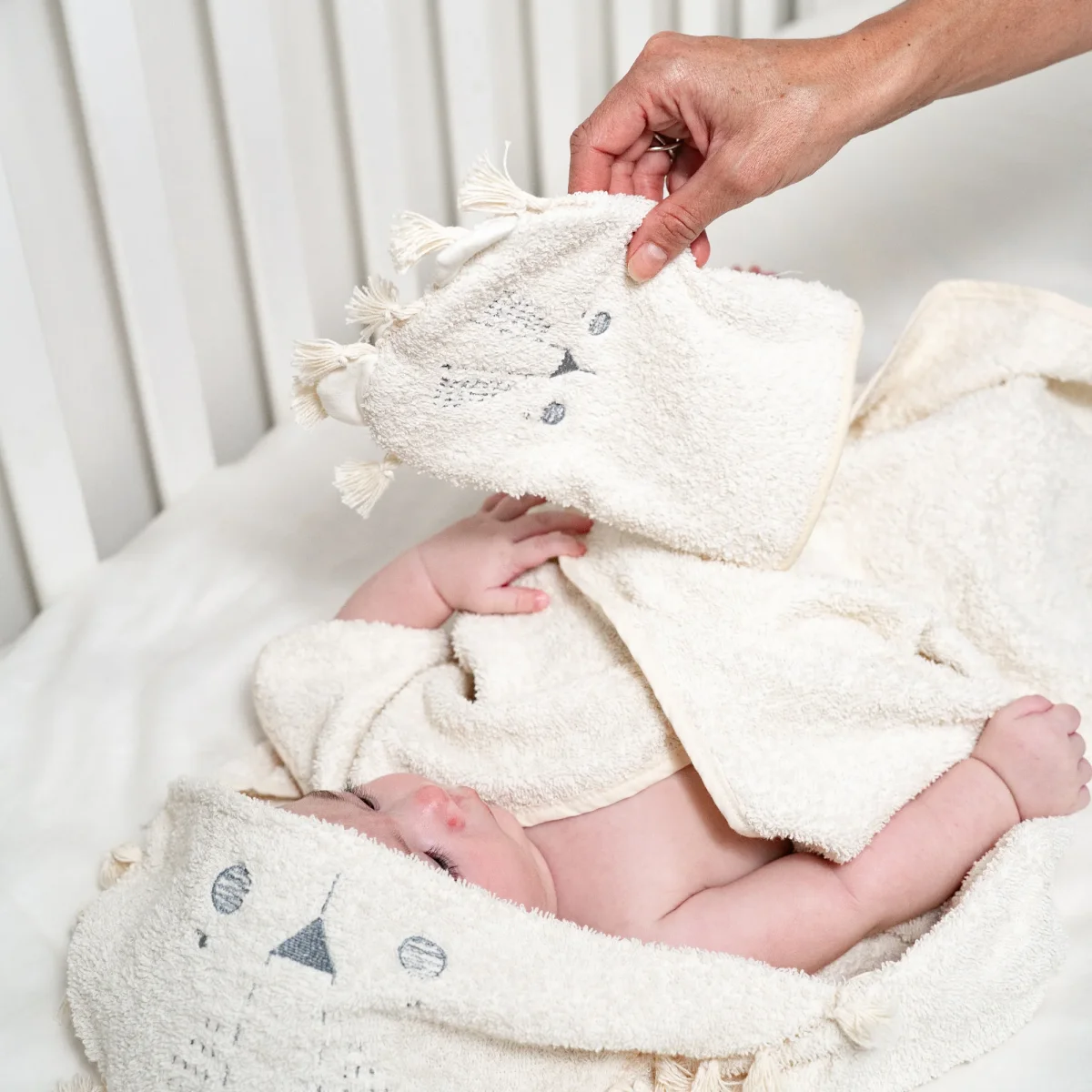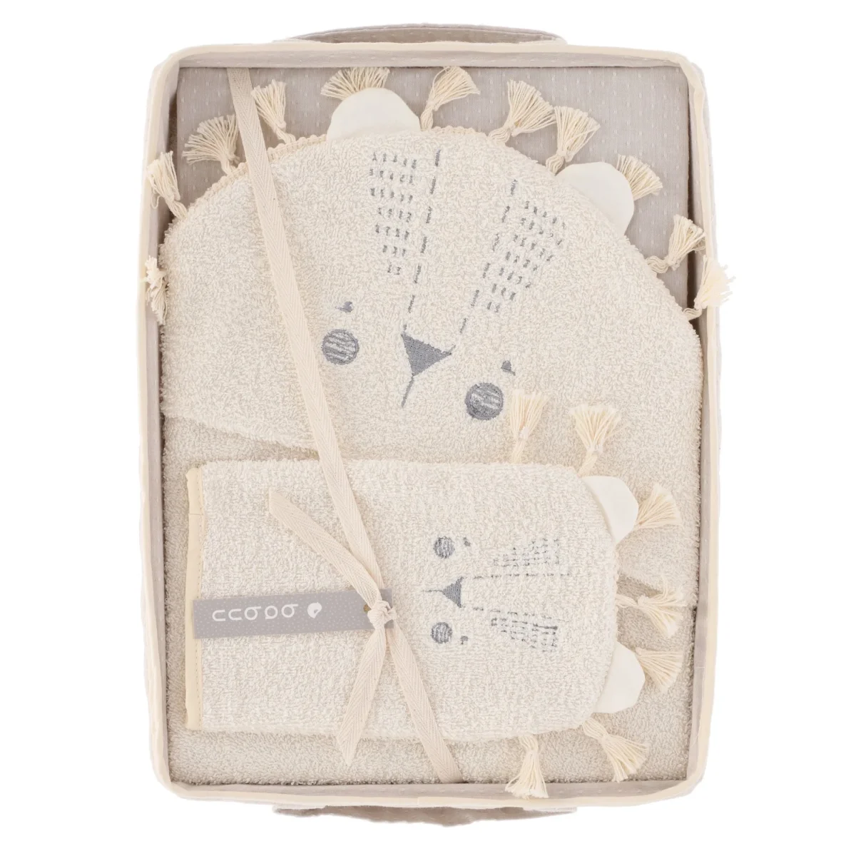 2. Toalla beige 100% algodón con capucha. La capucha tiene una capucha bordada con cara de león en tono gris claro. Detalle de meñena con tira de estambre suave color crudo. Mide 98 x 75 cm. Ideal para proteger a tu bebé de los cambios de temperatura al salir de la tina.