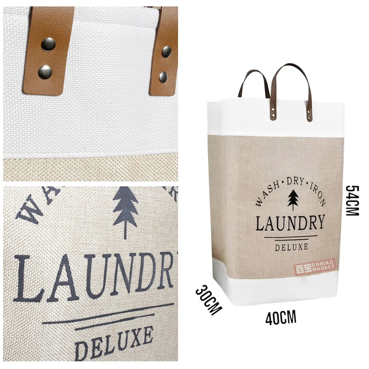 Organizá tu lavandería con estilo y practicidad. Este cesto para ropa sucia de 50 litros de capacidad está fabricado en tela resistente con diseño minimalista tipo lino y asas de cuero sintético, ideal para baños, dormitorios o lavaderos.