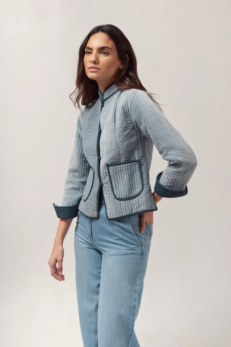 Chaqueta de terciopelo color azul claro, cuello mao y botonadura frontal hasta la cintura.