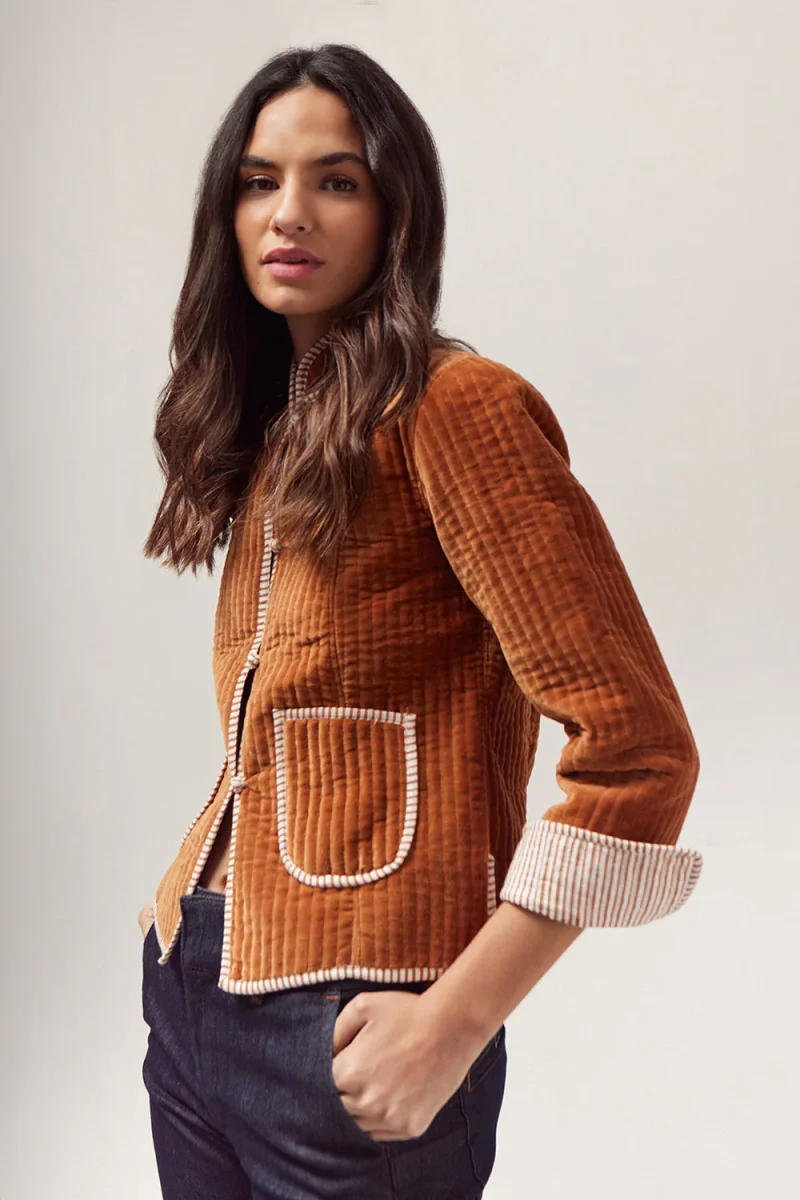 Chaqueta de terciopelo color teja, ribeteada en rayas, con cuello mao y botonadura frontal hasta la cintura.