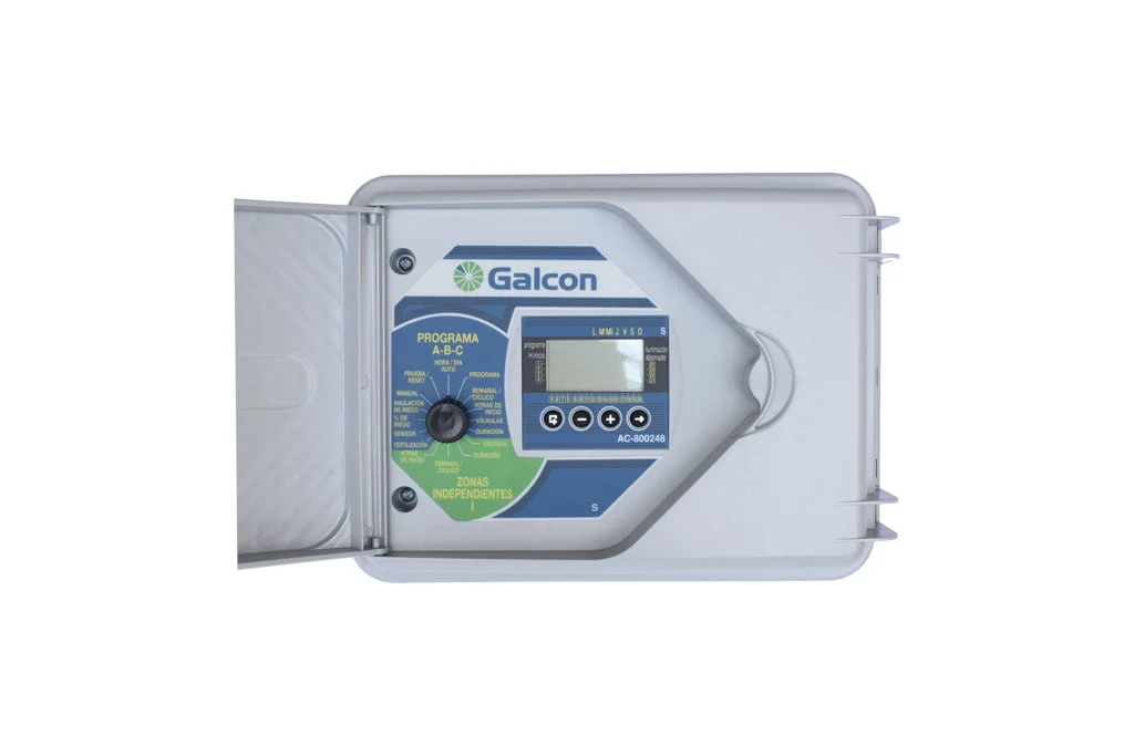 El Controlador Galcon es un dispositivo diseñado para optimizar y automatizar sistemas de riego en aplicaciones residenciales, comerciales o agrícolas. Con capacidad para controlar múltiples zonas de riego independientes, permite una gestión eficiente y personalizada de cada área. Modelos disponibles: AC 5086 y 800248