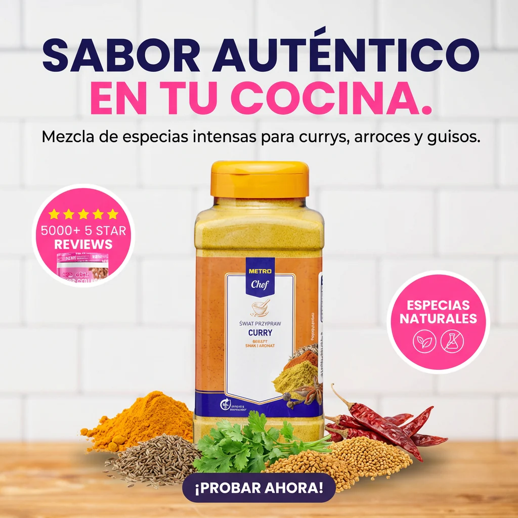 Mezcla de especias aromáticas que puede incluir cúrcuma, comino, coriandro, fenogreco, mostaza y chiles, entre otras. De sabor intenso, cálido y especiado, es fundamental en la cocina india y del sudeste asiático para sazonar guisos, arroces y currys.