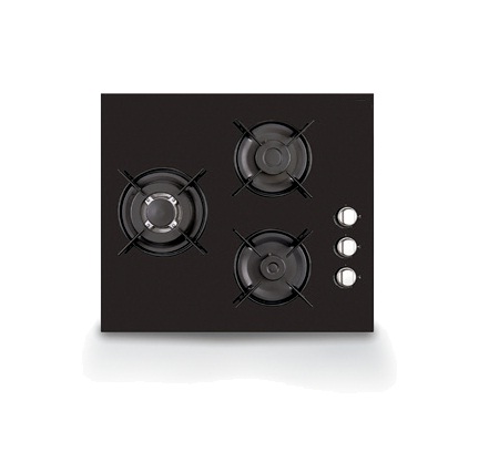 Encimera de cristal de gas. Uno de los fuegos es wok de 14 cm. Tiene válvula de seguridad y dispositivo de seguridad contra la llama. Los mandos son laterales.