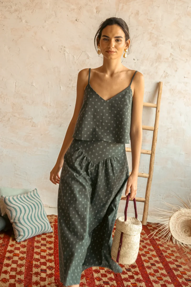 Falda midi confeccionada en tejido 100% algodón Cierre mediante cremallera lateral.