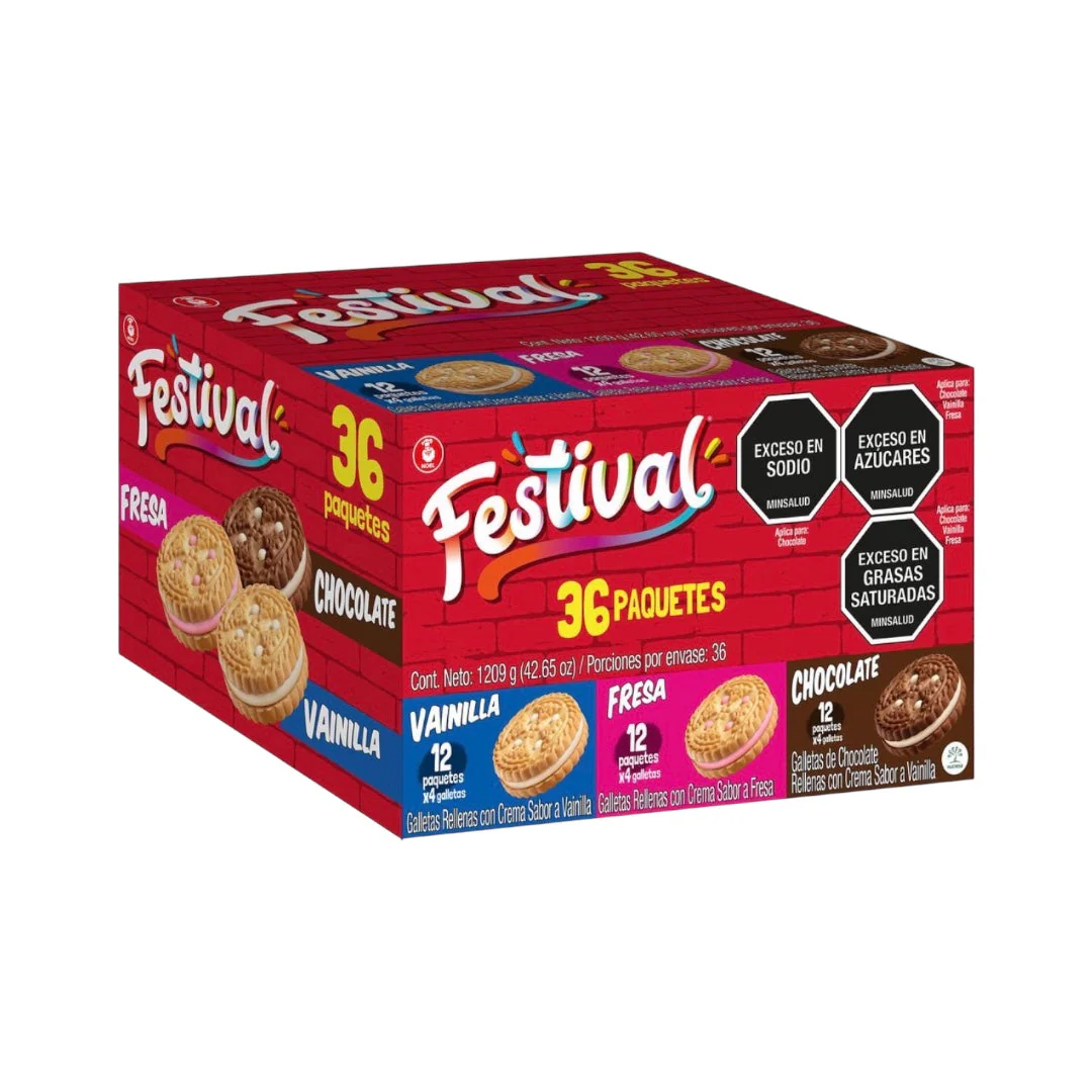Cada sabor de galletas Festival es único e inigualable, ofreciendo una experiencia de sabor que te dejará sin palabras. Imagina disfrutar de estas galletas en la oficina, compartiéndolas con tus compañeros de trabajo, o llevarlas en tu lonchera para sorprender a tus amigos en cualquier momento. Este paquete incluye 12 galletas rellenas de chocolate con crema sabor vainilla, 12 galletas con crema sabor vainilla y 12 galletas con crema sabor fresa. ¡Un verdadero festín para tus sentidos! Para conservar la frescura y calidad de estas deliciosas galletas, asegúrate de guardarlas en un lugar limpio, fresco y seco. Así podrás disfrutar de su sabor excepcional en cada bocado.