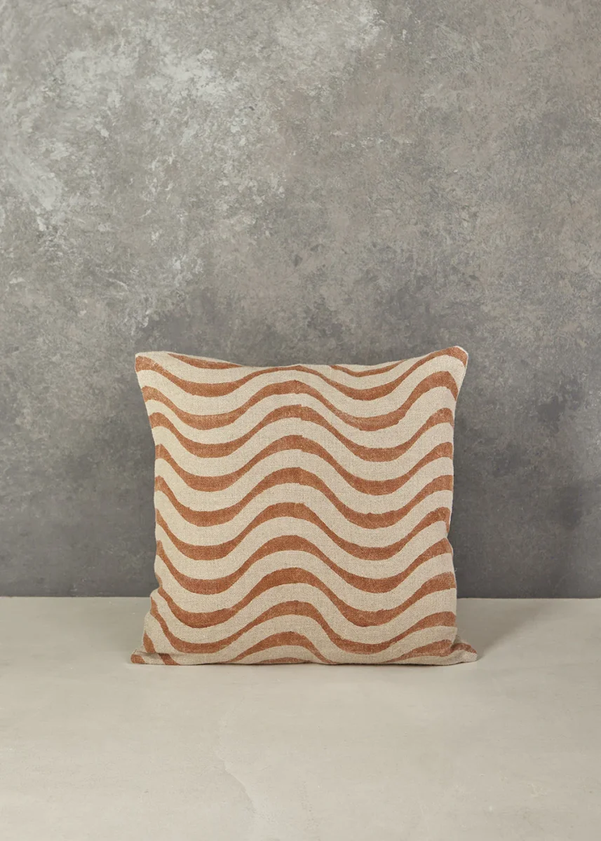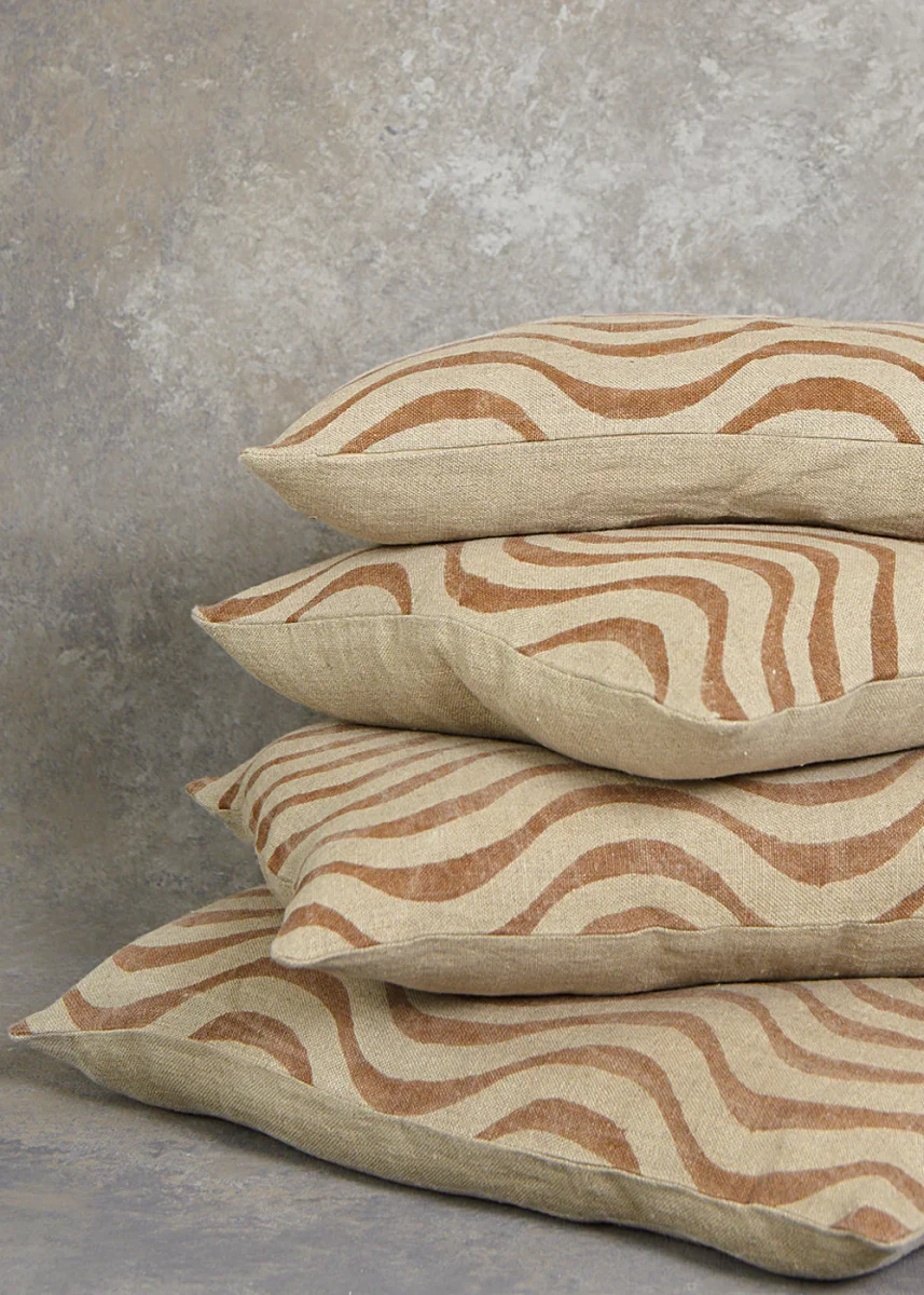Cojín de lino con estampado en distintos colores tejidos a mano.