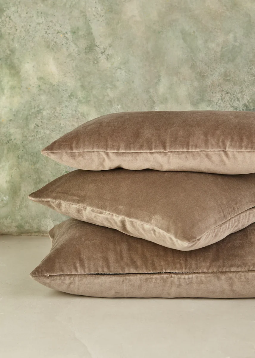 Fundas de cojín de terciopelo hechos de algodón proveniente de la India. Con un diseño monocromático es el elemento perfecto para la decoración del hogar.