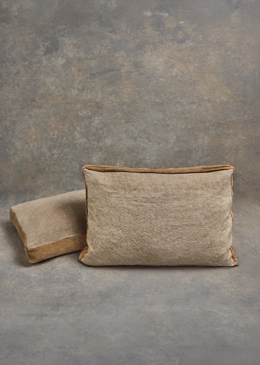 Funda de cojin que tiene dos colores y texturas diferentes: lino liso en la parte delantera y terciopelo de algodón en los bordes. Incluye relleno.