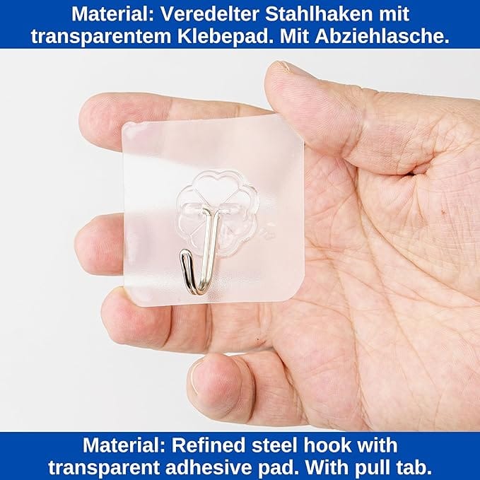 - Alta calidad: los ganchos adhesivos resisten hasta 6,8 kg por gancho en la pared y el techo. No es necesario taladrar, tripular, hacer agujeros. El gancho mágico transparente puede girar 180 grados, lo que lo hace posible colgar en techos. Estas perchas adhesivas están hechas de acero y material de PVC. Resistente al agua y al aceite, resistente a altas y bajas temperaturas.