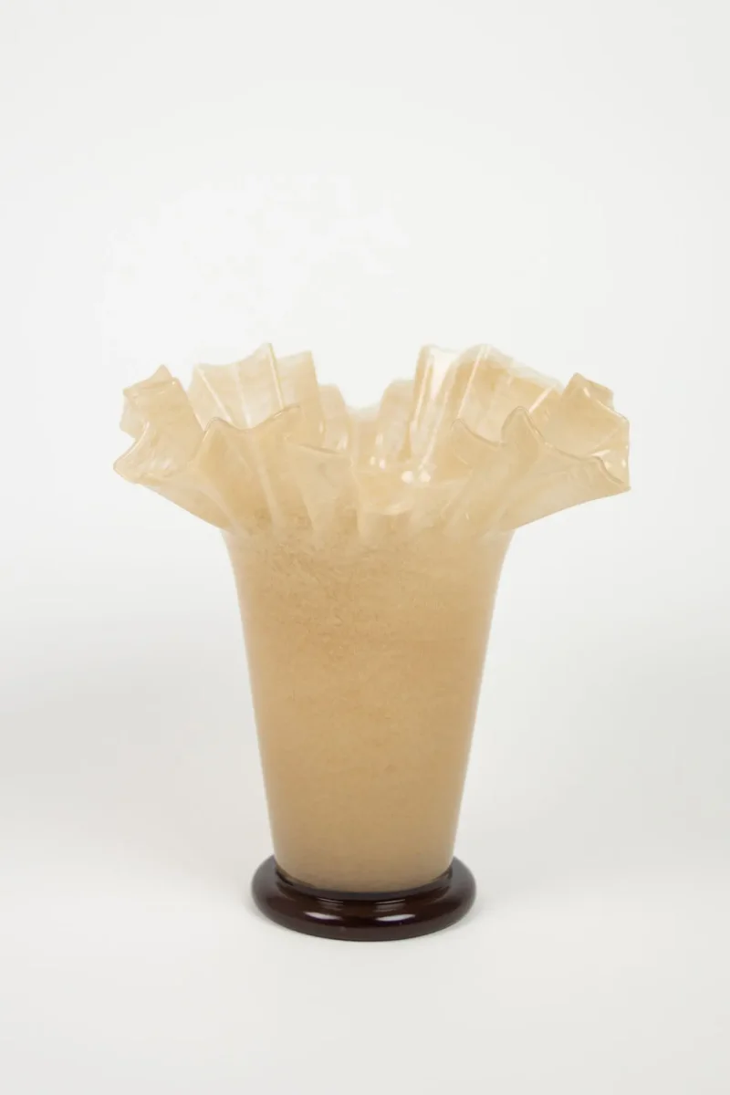 El jarrón está hecho de vidrio soplado a boca, mediante una técnica tradicional que crea hermosas vetas en el vidrio. Al ser artesanal, presenta variaciones de color y forma que hacen que cada jarrón sea único.