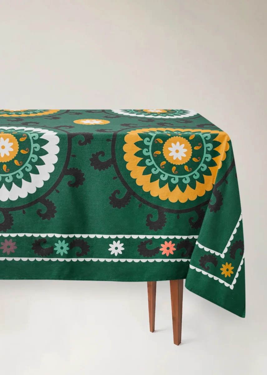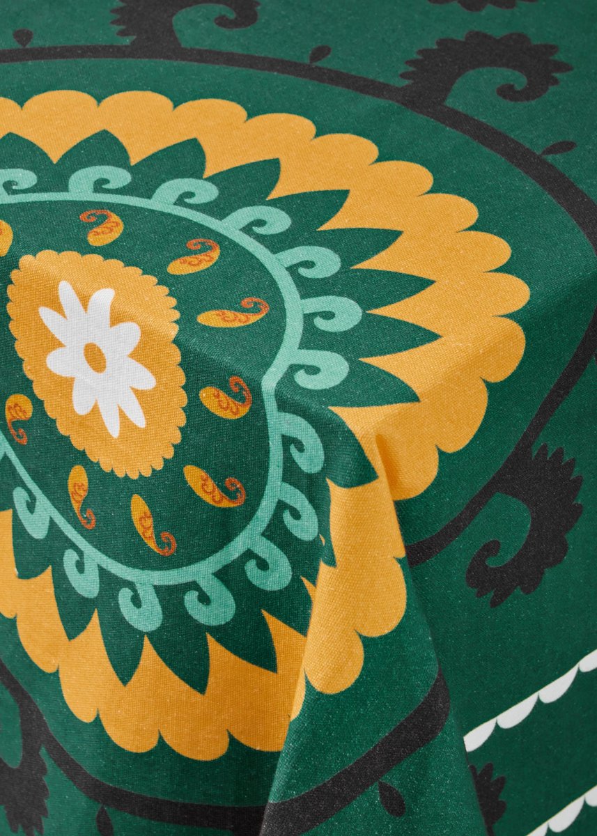 En este mantel predomina el color verde y tiene acentos amarillos, verde menta, blancos y negros.