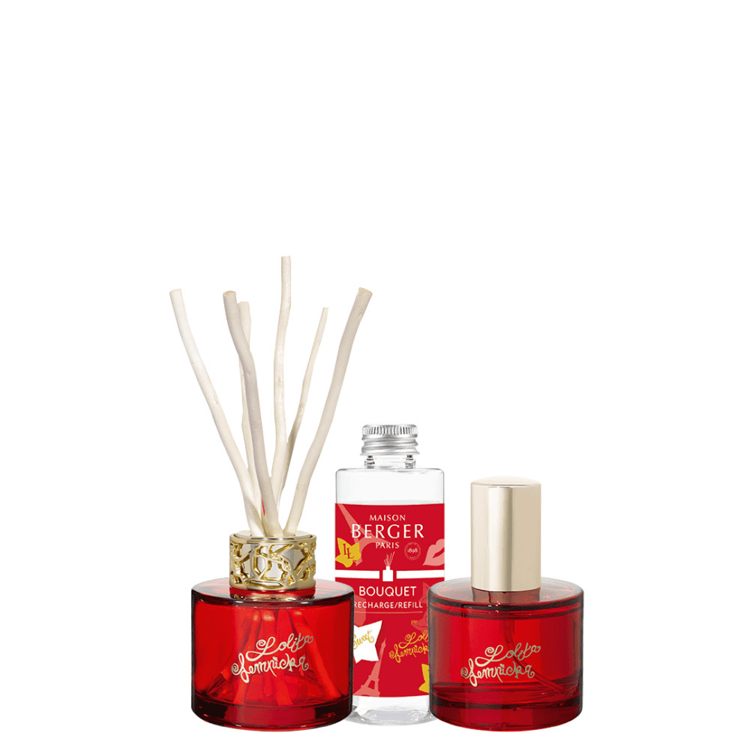 Práctico cofre mini dúo Lolita Lempicka Sweet de Maison Berger, con un aroma ligeramente dulce, que mezcla, el olor de frutos rojos como la cereza y la frambuesa, el cacao y el praliné, sobre un fondo almizclado.