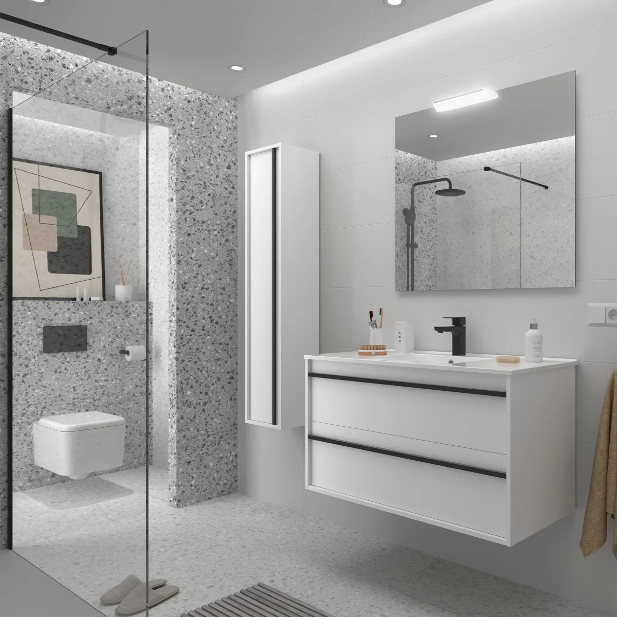 Los muebles de baño ATTILA destacan por su característico tirador negro para los acabados madera y en el misma acabo del mueble para el acabado mate. Además, incluye el organizador de cajón e incorpora guías HETTICH con cierre amortiguado.
