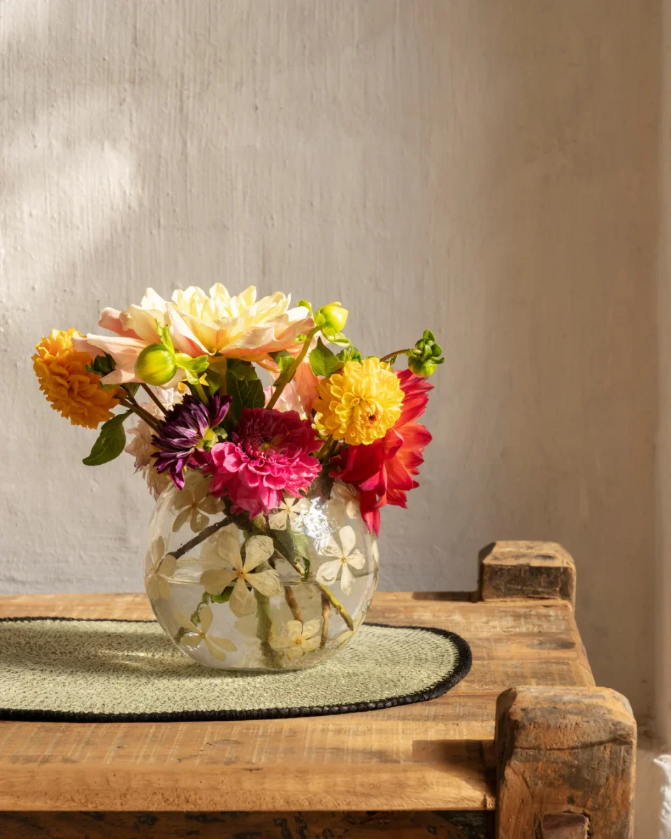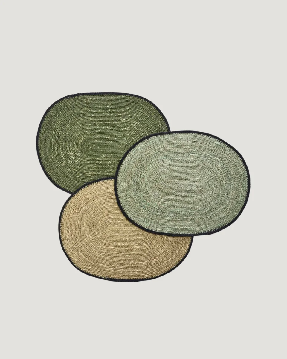 Pack de 2 individuales disponibles en verde oscuro, verde claro, natural y negro, permite combinaciones creativas. Teñido a mano y secado al sol en la India, el junco marino es moldeado por artesanos expertos, lo que garantiza un producto sostenible y de calidad.