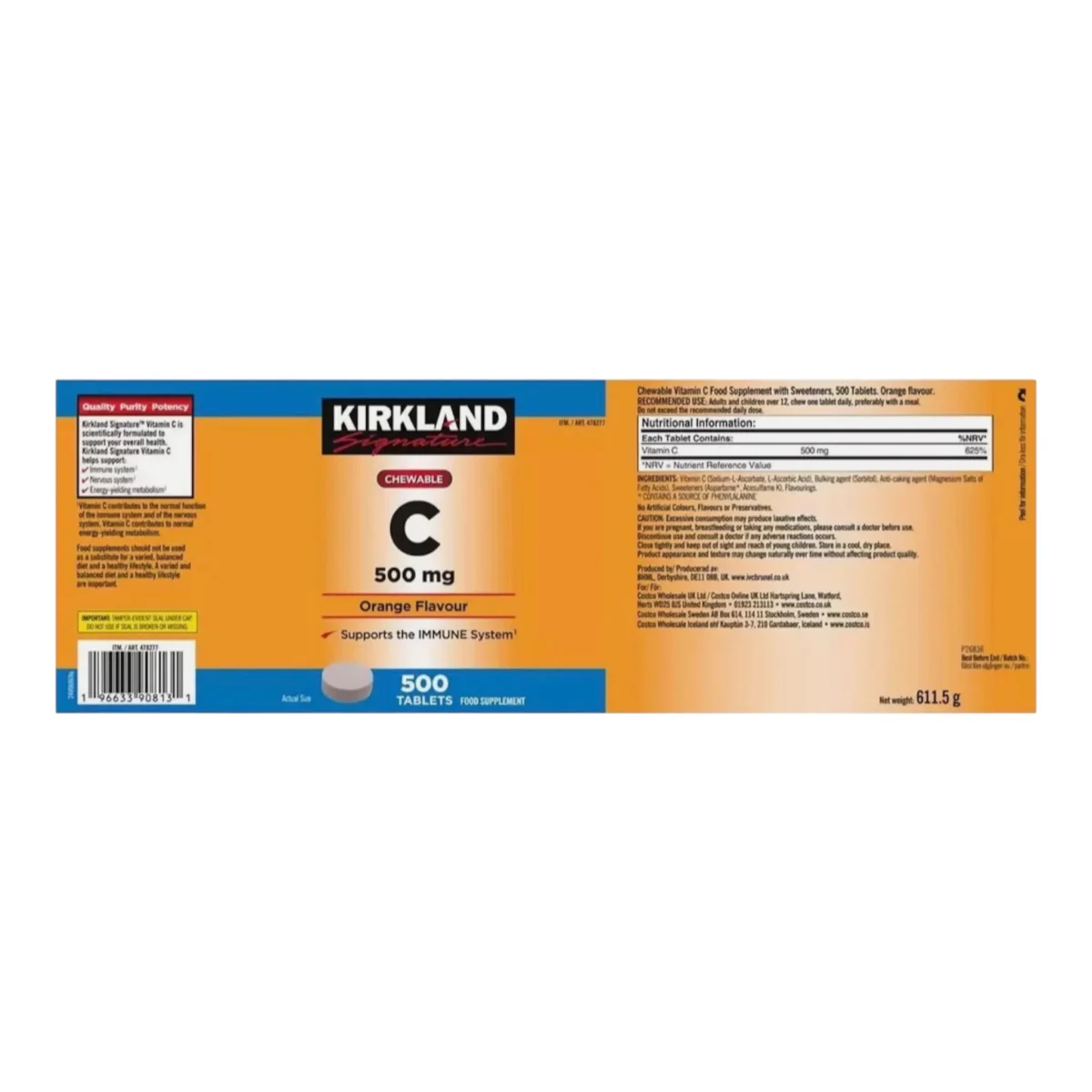 Vitamina C Kirkland 500mg (tabletas), ideal para apoyar el sistema inmunitario y contribuir a la protección frente al estrés oxidativo.