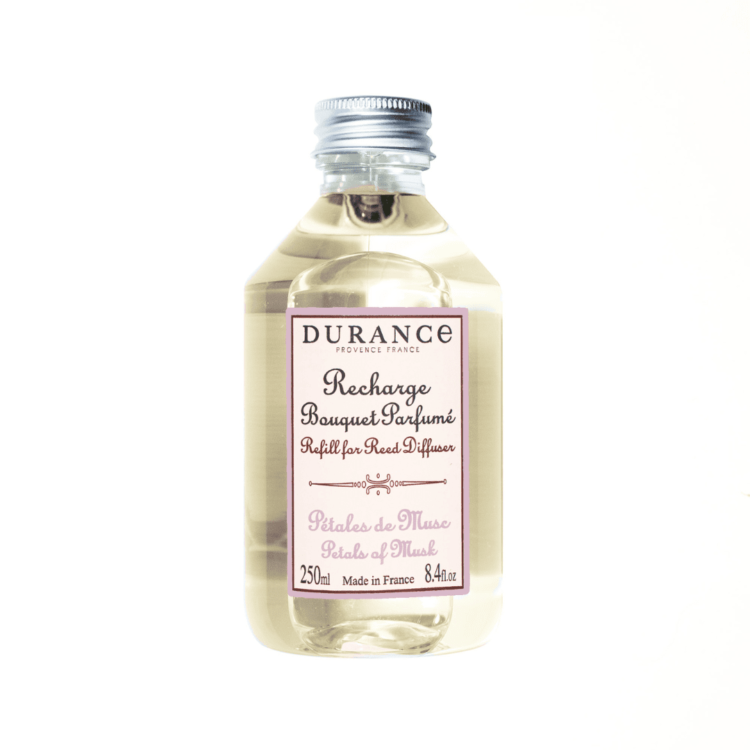 Sigue disfrutando de tu difusor de varillas o bouquet con el recambio de mikado Pétalos de Almizcle -250ml de Durance. Su fragancia floral, suave y limpia de notas almizcladas, nos ayuda a mantener perfumado nuestro entorno y evita que se genere un ambiente cargado y pesado, aportando bienestar, calidez y buen gusto.