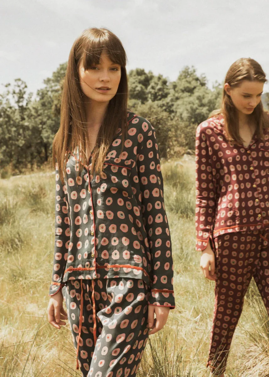 Set de pijama formado por la camisa de manga larga y cierre frontal de botones, el pantalón largo con cintura elástica y bolsillo laterales. Destaca por ser fibra natural de Centón, sus estampados y las tonalidades de los tejidos.