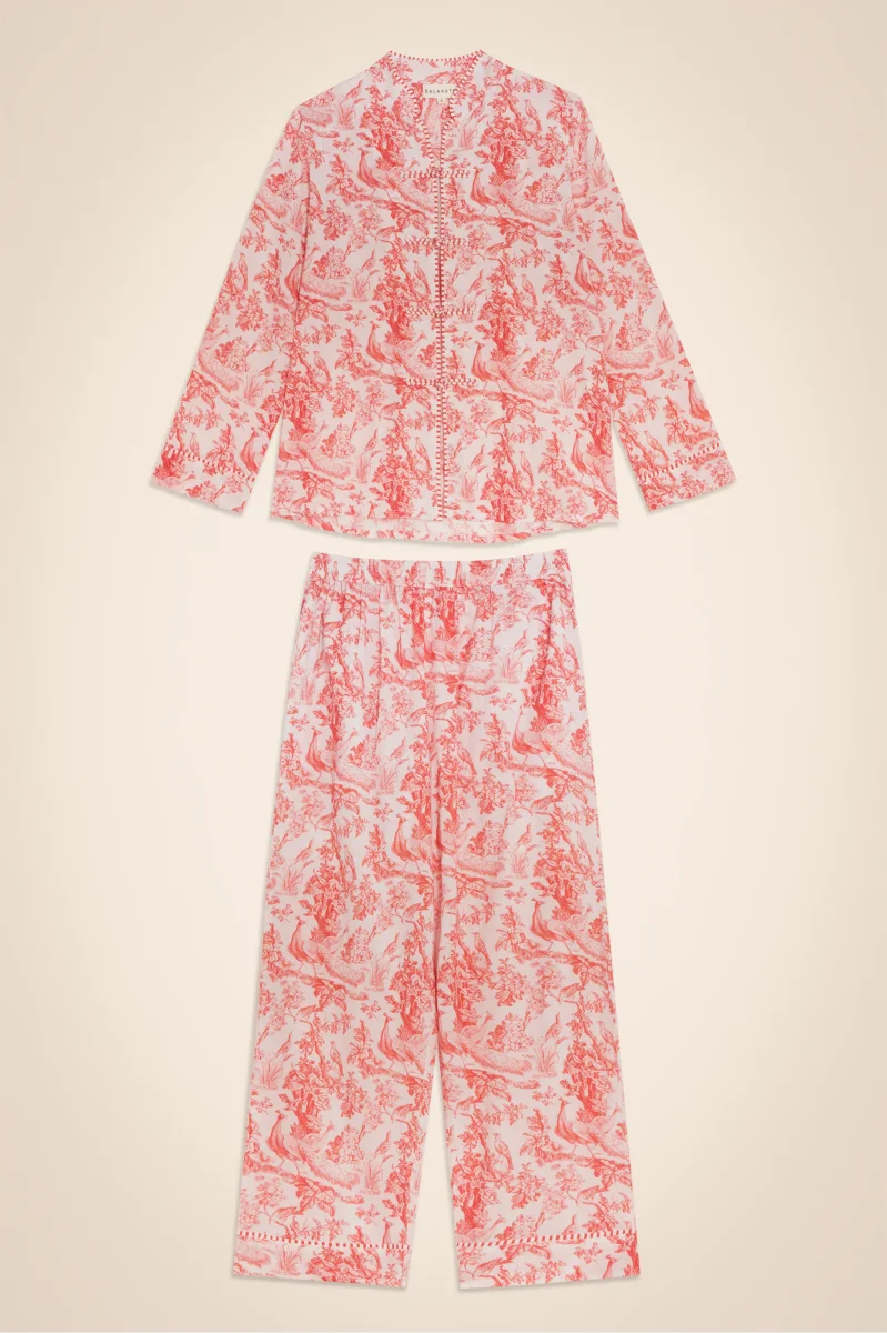Pijama de algodón estampado Toile De Jouy. El diseño representa pavos reales en la naturaleza y pájaros a su alrededor.