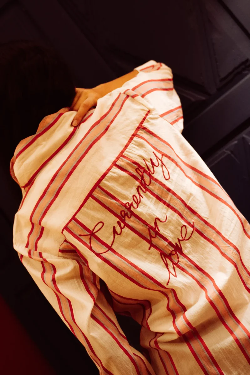 Camisa abotonada por delante, cuenta con un bolsillo en el lado superior izquierdo. Pantalón ajustado con elástico. Con el detalle de bordado en la parte trasera.