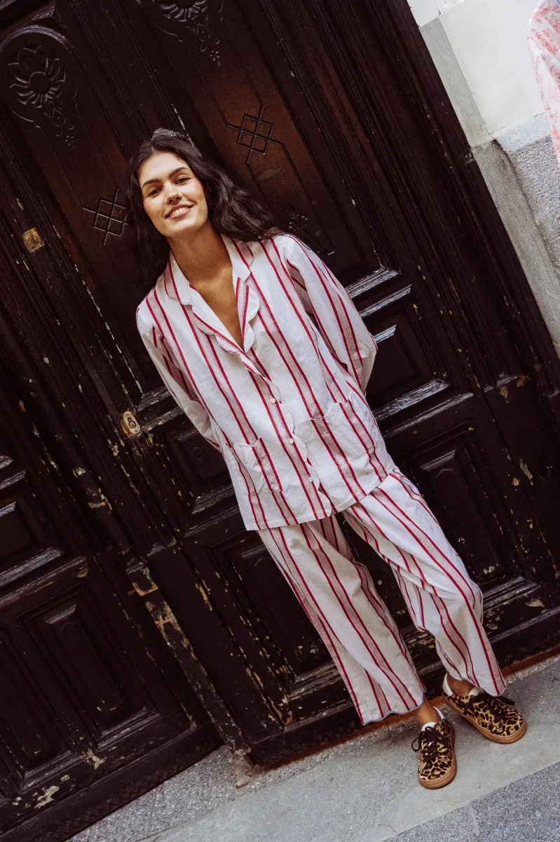 Pijama de algodón largo de dos piezas, con diseño a rayas rojas, azul celeste, rosas y blancas, y terminación de las dos prendas en diseño ondas.