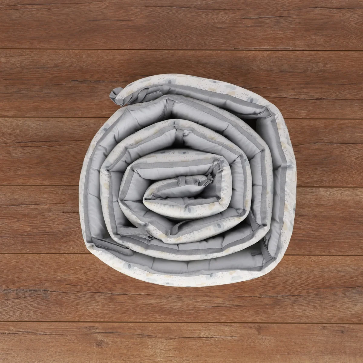 - Tiene 4 costuras verticales que se acomodan perfectamente en cada esquina de la cuna.