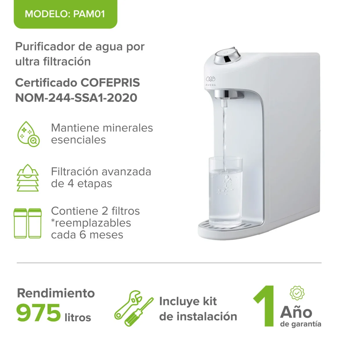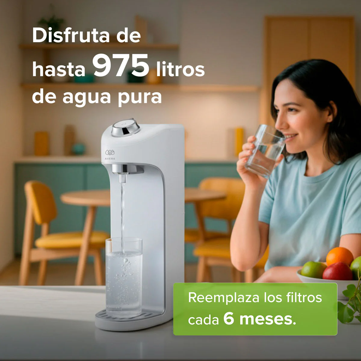 Olvídate de cargar garrafones pesados y de la incertidumbre sobre la calidad del agua que bebes. Con el purificador de agua por ultrafiltración Avera, tu vida es más sencilla y práctica. Este sistema transforma el agua de la llave en un oasis de frescura, lista para beber al momento. Mejora el sabor de tus platillos y brinda a tu familia la seguridad de una hidratación superior con tecnología diseñada para el hogar mexicano.