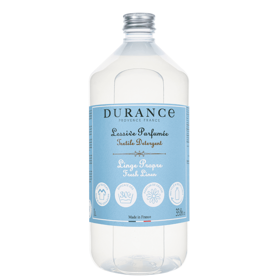 El detergente natural perfumado Ropa Limpia -1L de Durance, sin colorantes, sin conservantes y sin ingredientes de origen animal, está formulado con un 80% de ingredientes de origen natural.