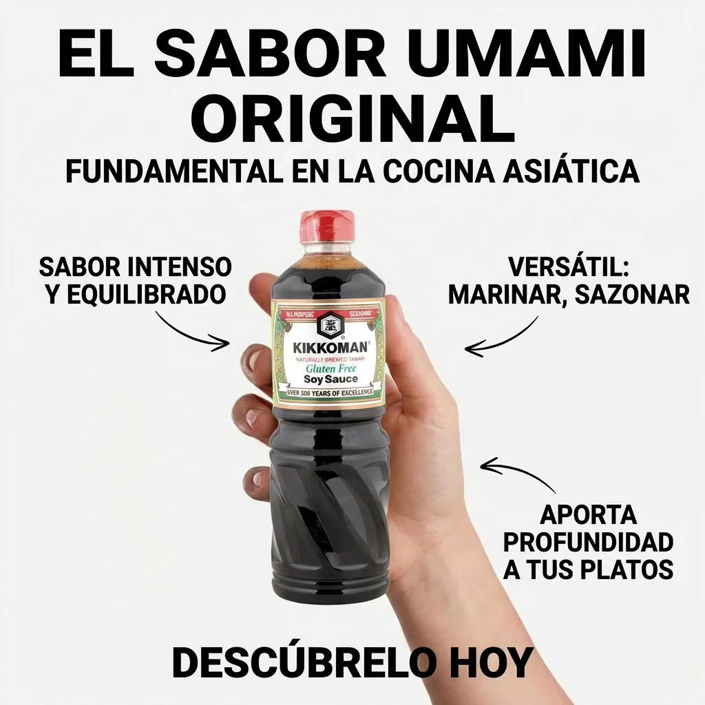 Condimento líquido fermentado hecho a base de soja, trigo, agua y sal. De sabor umami intenso, salado y ligeramente dulce, es fundamental en la cocina asiática para marinar, sazonar y dar profundidad a sopas, salteados, sushi y mucho más. Disponible en versiones clara y oscura, aporta color y sabor característico a los platos.
