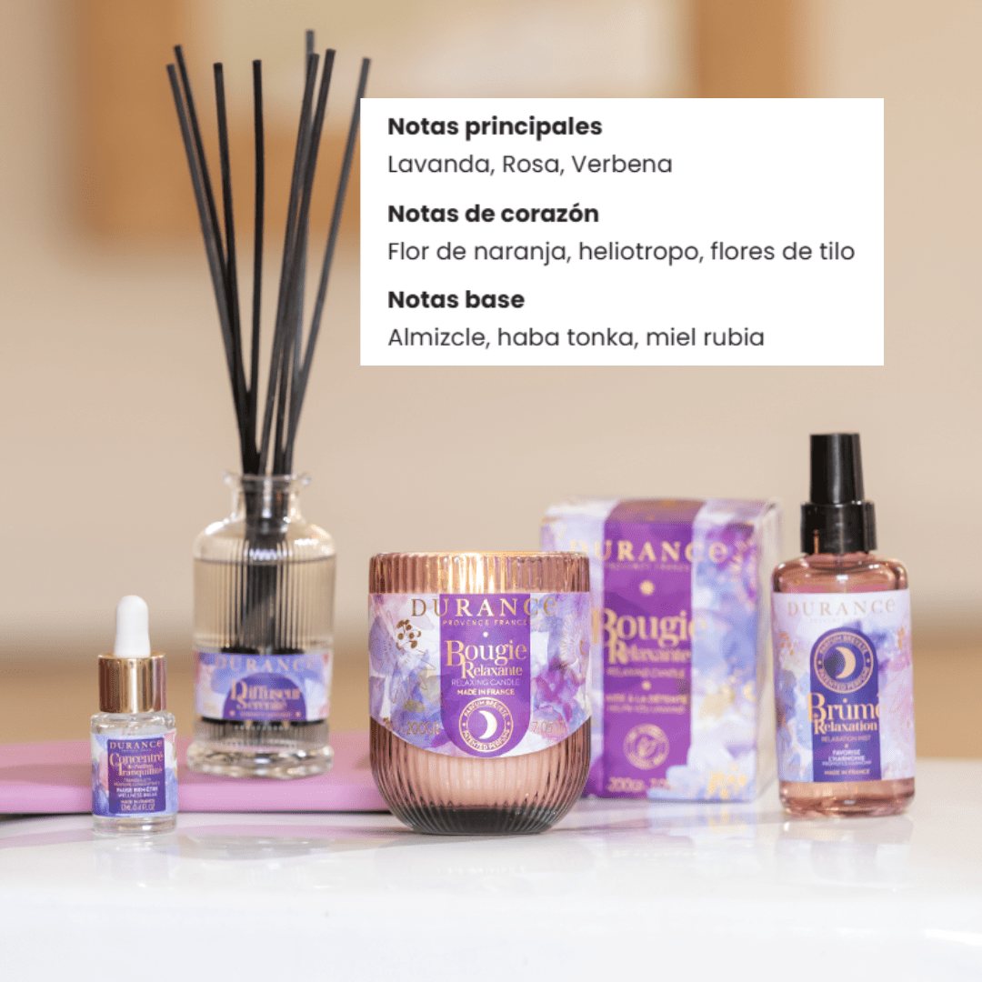 Su aroma calmante de lavanda y de notas reconfortantes como, la flor de azahar, las flores de tilo y la miel rubia, propicia la relajación y el bienestar, creando un entorno agradablemente perfumado. Ponlo en zonas de descanso y de desconexión para beneficiarte de las propiedades que nos ofrece.