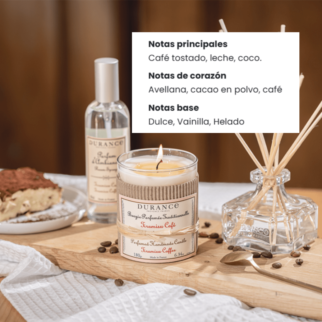 Sigue disfrutando de tu difusor de varillas o bouquet con el recambio de mikado Tiramisú Café -250ml de Durance. Su fragancia cálida y exquisita por la vainilla dulce y el café tostado, con notas de coco y cacao en polvo, nos ayuda a mantener perfumado nuestro entorno y evita que se genere un ambiente cargado y pesado, aportando bienestar, calidez y buen gusto.