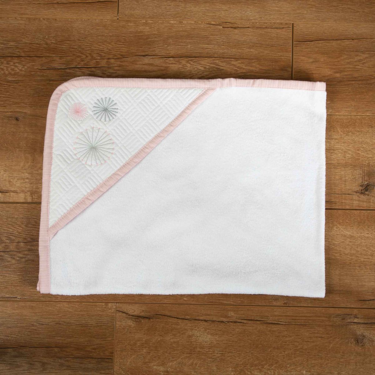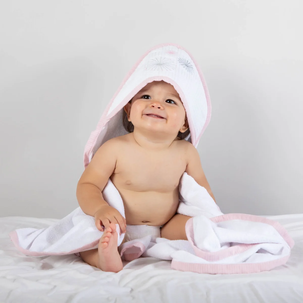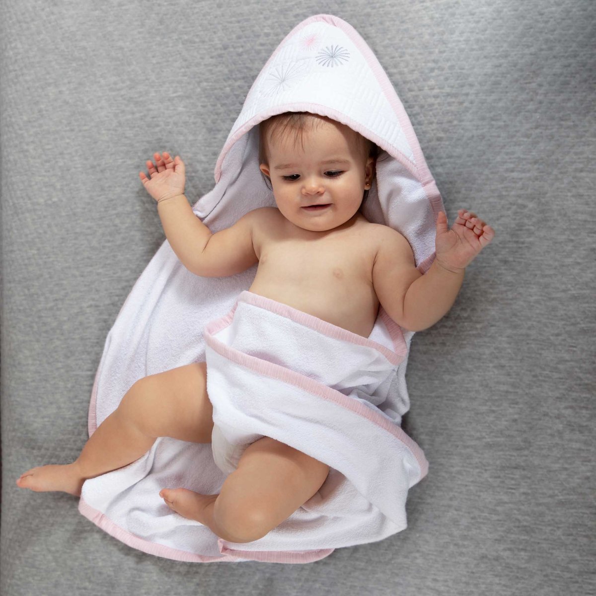 Cuida la piel sensible de tu bebé con nuestras suaves toallas de baño para bebé 100% algodón con diseño bordado en colores rosa pastel. La capucha protege del aire los oídos de tu bebé, al sacarlos del agua.
