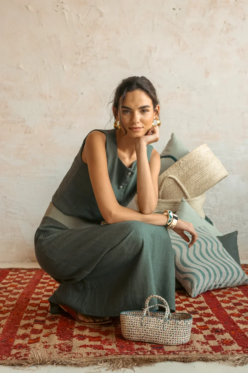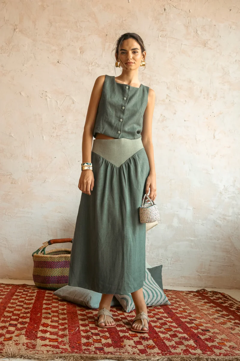 Top confeccionado en tejido 100% lino .Sin mangas. Cierre mediante botonadura frontal.