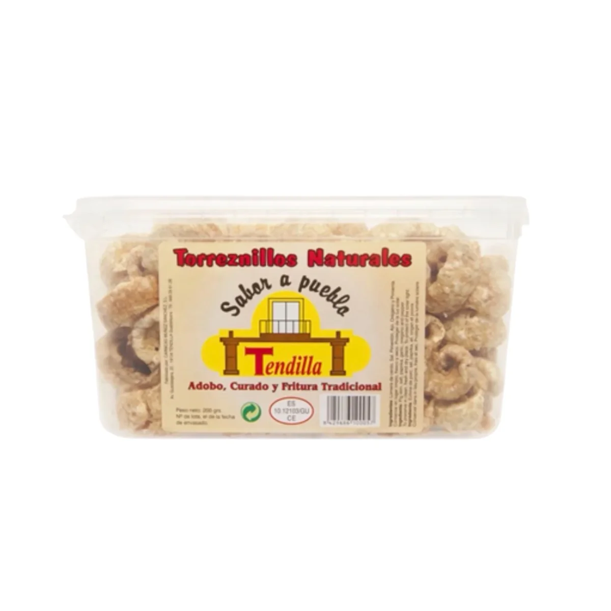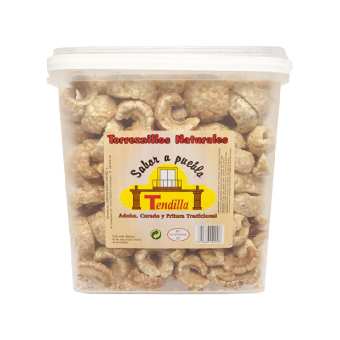 Los Torreznillos Fritos de Tendilla son un aperitivo tradicional español, elaborado artesanalmente a partir de corteza y tocino de cerdo de primera calidad. Adobados con especias como pimentón, ajo, pimienta y orégano, y posteriormente fritos, ofrecen una textura crujiente y un sabor intenso que los hace ideales para acompañar tapas, ensaladas o disfrutar solos